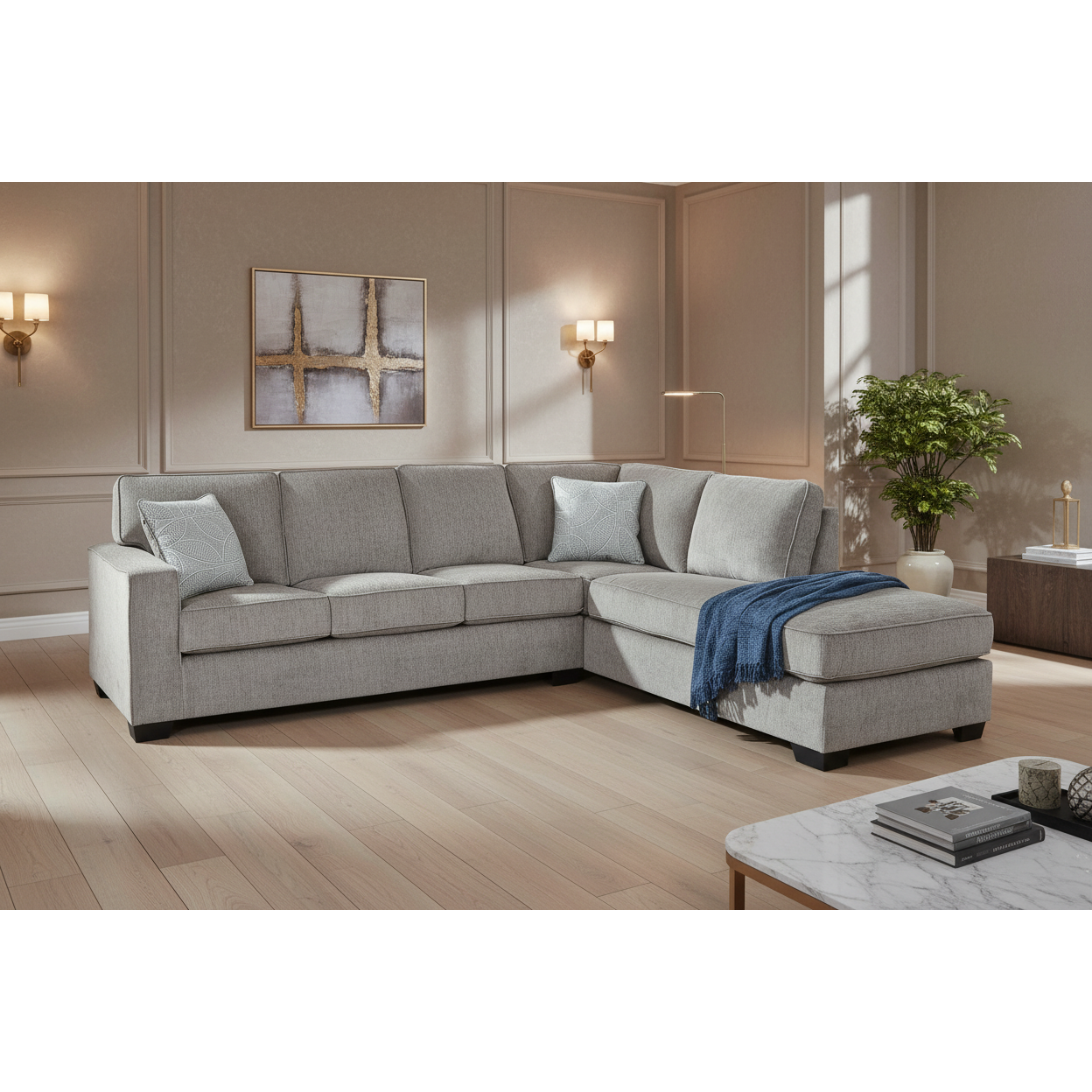 If style is the question, then this sectional sleeper is the answer. Sporting clean lines and sleek track arms, its decidedly contemporary profile is enhanced with plump cushioning and chenille-feel upholstery, so pleasing to the touch. This sleeper sectional in a rich slate is sure to complement a variety of color schemes, while the understated floral-patterned pillows bring a fresh, fashionable appeal. Crafted with quality memory foam, the pull-out full mattress comfortably accommodates overnight guests.