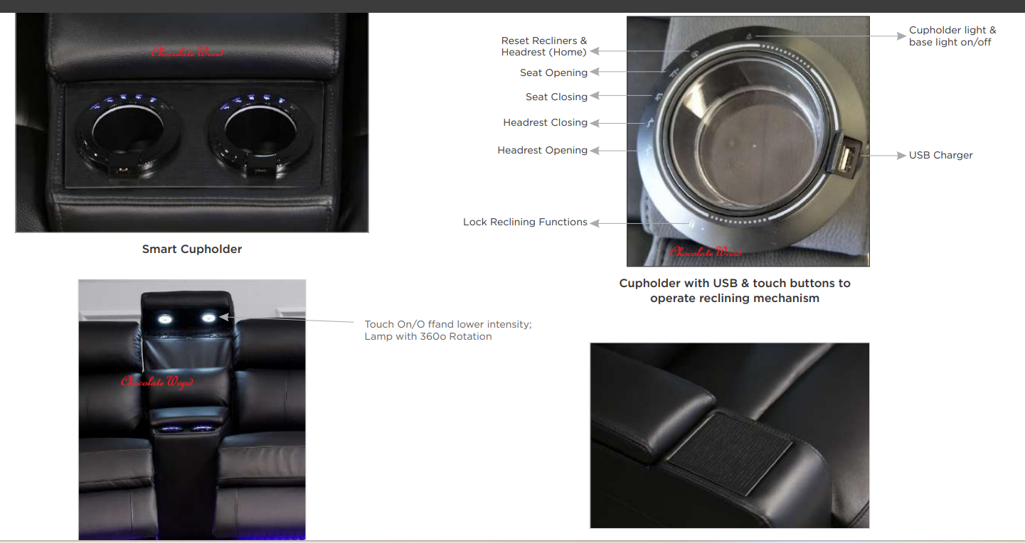 • Smart cupholder includes USB charger and buttons for headrest & footrest