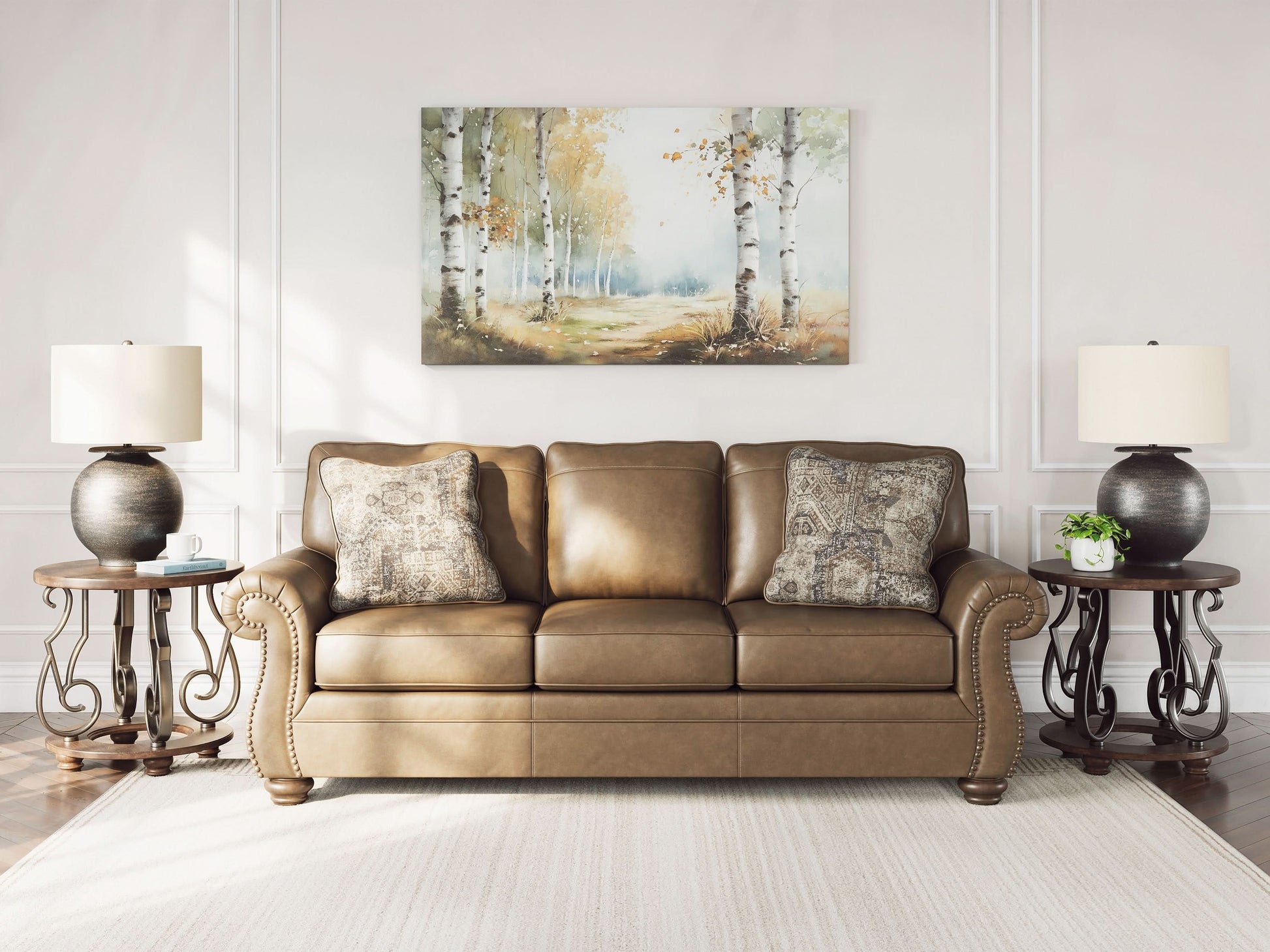 This beautifully crafted sofa in rich, faux leather upholstery combines rustic charm with modern durability while plush cushions invite you to relax and unwind. Traditional rolled arms are highlighted by classic nail head trims, adding a refined touch of sophistication. Distressed chenille accent pillows enhance the texture and visual appeal and the turned wooden legs complete the look with a nod to heritage craftsmanship.