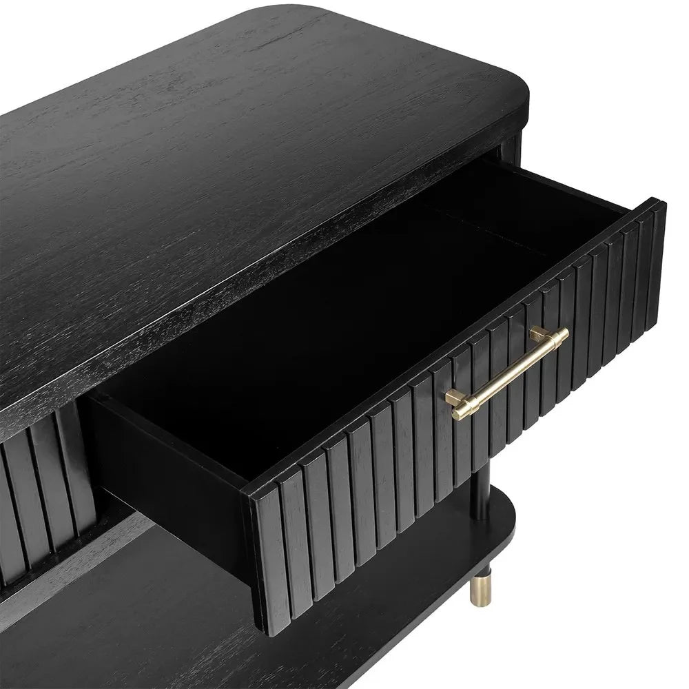 The Pembroke Console Table in Black is a refined accent piece that blends modern elegance with functional design. Featuring vertical fluted panelling, sleek brass handles, and slim black legs with brass-capped feet, it creates a sophisticated focal point for hallways, entryways, or living spaces. A spacious surface and open lower shelf provide practical storage and display options, while its streamlined silhouette enhances both contemporary and transitional interiors. Also available in White and Oak Natural finishes to suit a variety of styles.