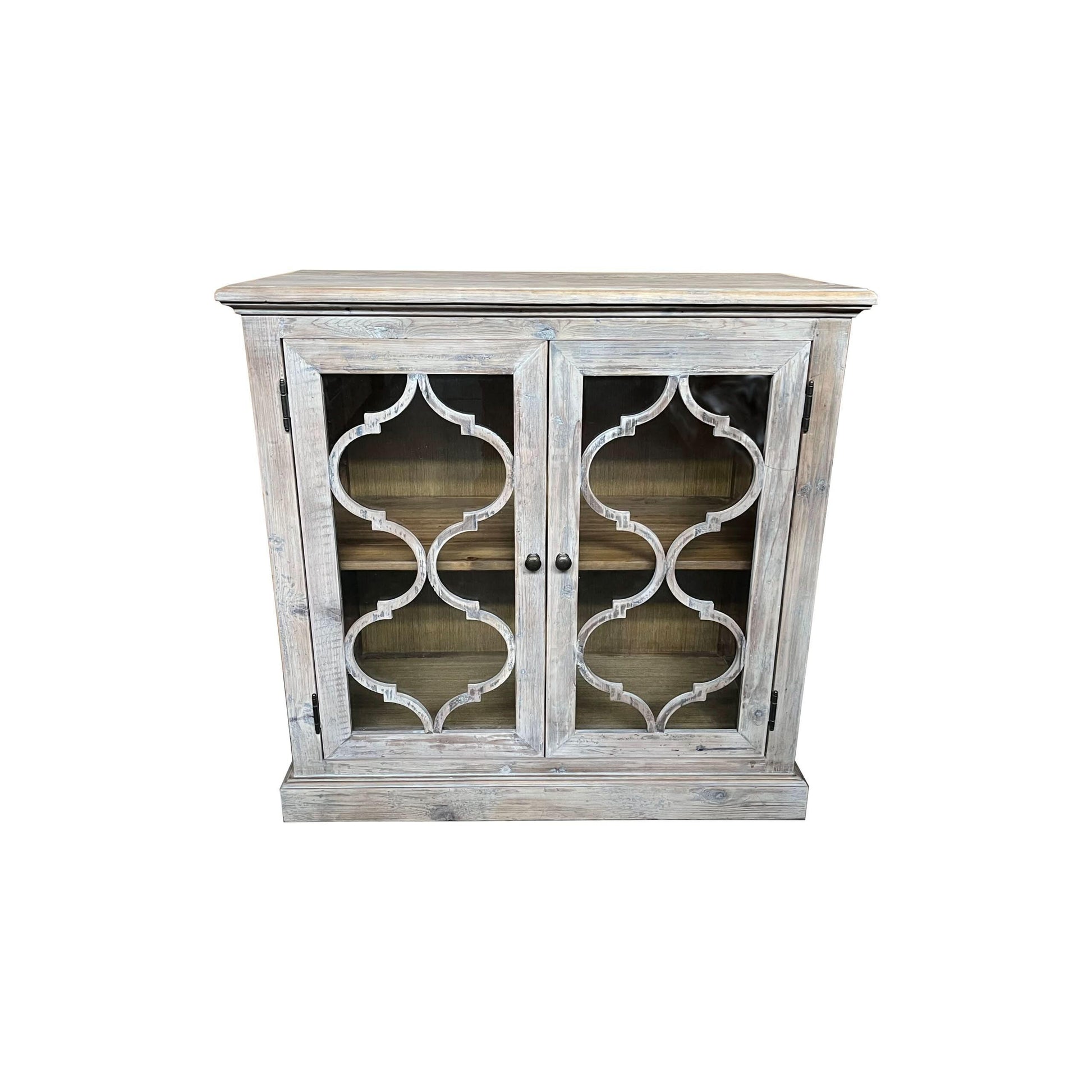REINA GREYWASHED RECYCLED TIMBER/GLASS PANELS 2-DOOR CABINET CUPBOARD