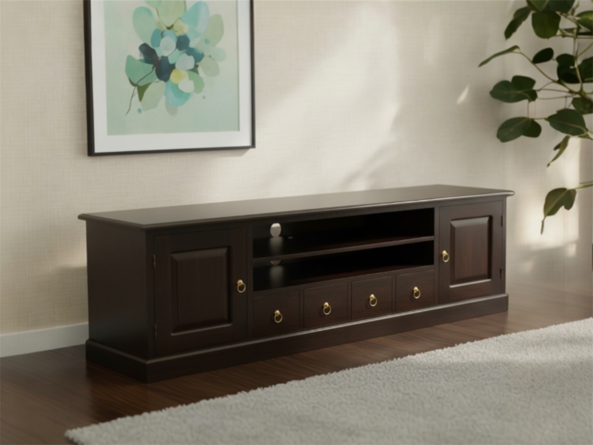 This beautiful tv unit has been handcrafted in Indonesia from solid kiln-dried mahogany timber by professional craftsmen.