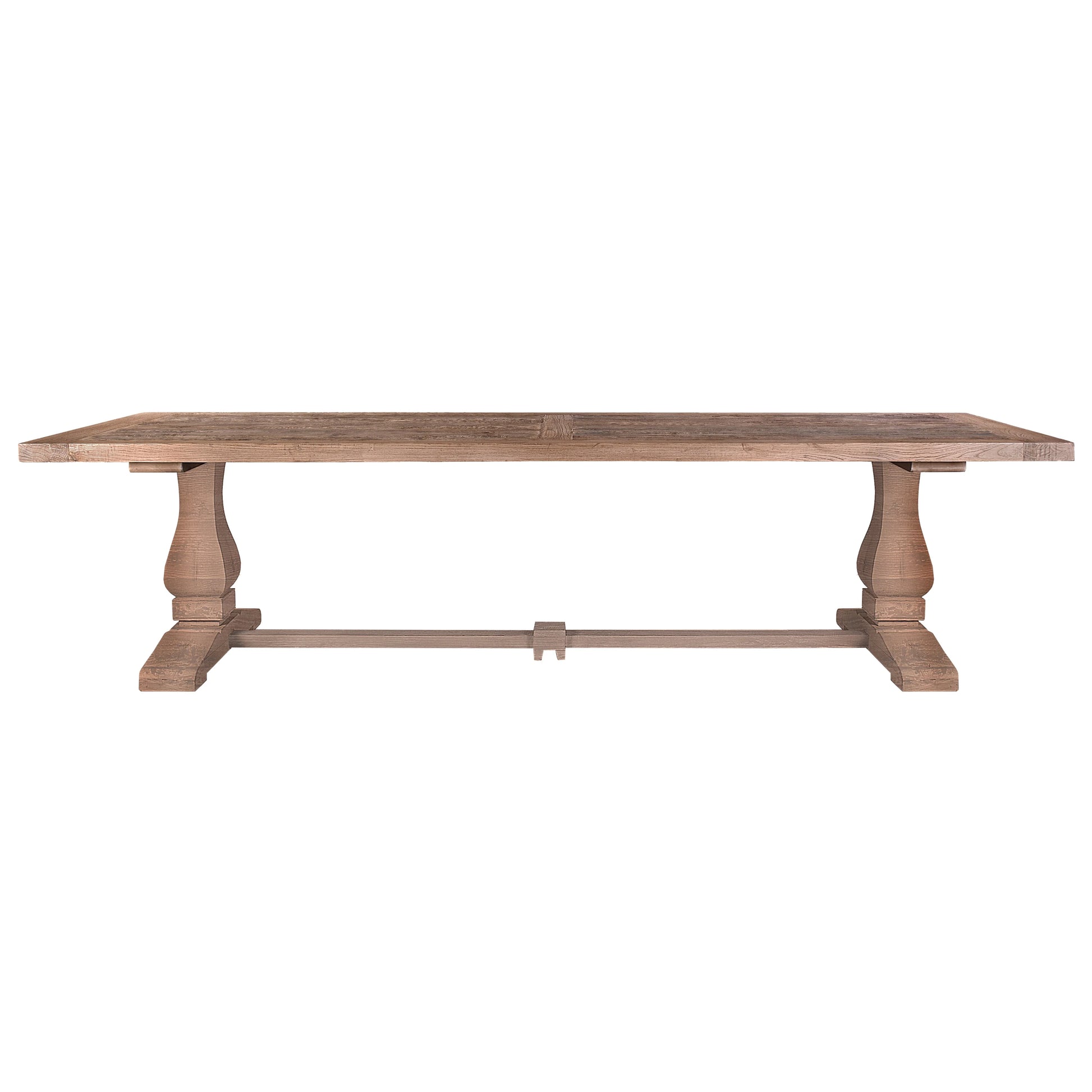 The Maddox 3m Dining Table is a magnificent piece crafted from recycled elm timber, showcasing its unique character and rich history through the beautiful grain and natural imperfections of the wood. This grand table features a carved double pedestal base with a sturdy support bar, providing both stability and a touch of intricate detailing. With its impressive 3-meter length, the Maddox Dining Table comfortably accommodates 10 to 12 guests, making it perfect for large gatherings and celebratory feasts. Its design effortlessly complements French farmhouse or Hamptons interiors, adding a touch of rustic elegance and timeless charm to any dining space.
